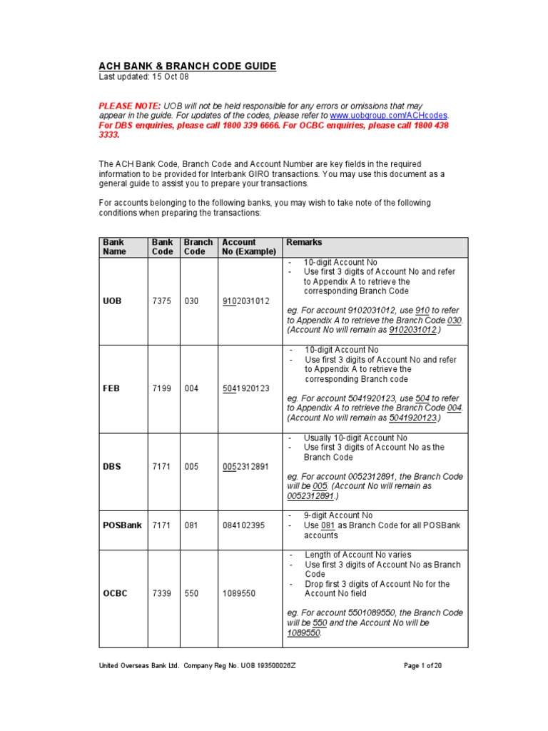 Singapore Bank And Branch Codes Achcode Pdf Banks Financial Services