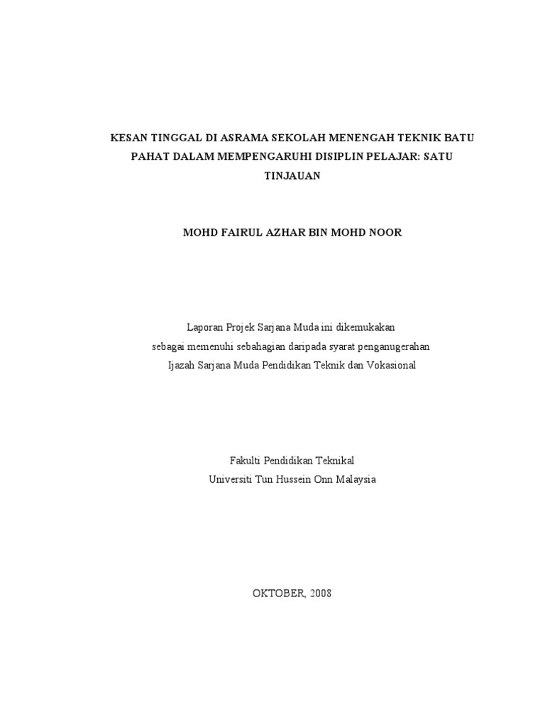 Kesan Tinggal Di Asrama Sekolah Menengah Teknik Batu Pahat Dalam Mempengaruhi Disiplin Pelajar Satu Tinjauan Pdf